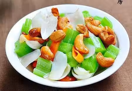 腰果50克;百合50克;西芹100克;胡蘿蔔50克;鹽1/4小匙;砂糖1/2小匙