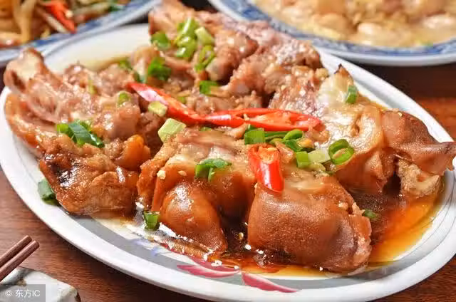 4、加入豬蹄、料酒、蔥、姜、鹽、花椒,湯燒開後除去浮沫,用大火燒至豬蹄上色後,移至小火燉爛,收濃汁即成。