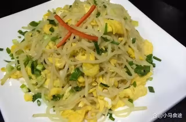 3.再起鍋燒油,下入小蔥白末爆一下香味,下入蒸過的土豆筋,翻炒均勻,調入鹽、生抽、五香粉、雞精,翻炒入味,下入雞蛋再次炒勻,撒入適量小蔥花即可出鍋裝盤。