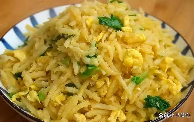 2.起鍋燒油,下入蔥花爆香,淋入打散的雞蛋液炒熟,下入洋芋擦擦快速炒勻,調入鹽、生抽、味精、少許胡椒粉,翻炒均勻即可出鍋裝盤。