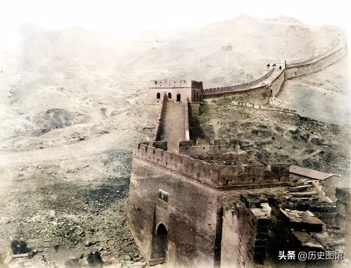 站在北京八達嶺長城的烽火台上,向遠處眺望。長城猶如一條巨龍,在崇山峻岭間蜿蜒盤旋。長城是中華民族的象徵。照片拍攝於1877年。