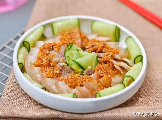 4、煮好的肉放至溫涼時切片。將肉片擺在黃瓜上面。