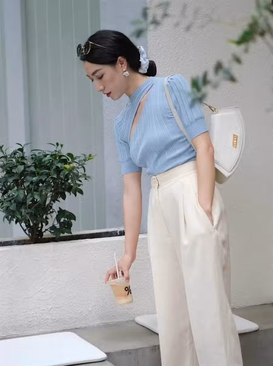 建議大家在搭配霧霾藍+其他色系的時候,最好 利用色差將身材的比例進行修飾襯顯,尤其是 五五身材的女性,上短下長的搭配組合最為襯托好比例,加上霧霾藍色的氣質襯托,襯得 穿衣人更顯高級。