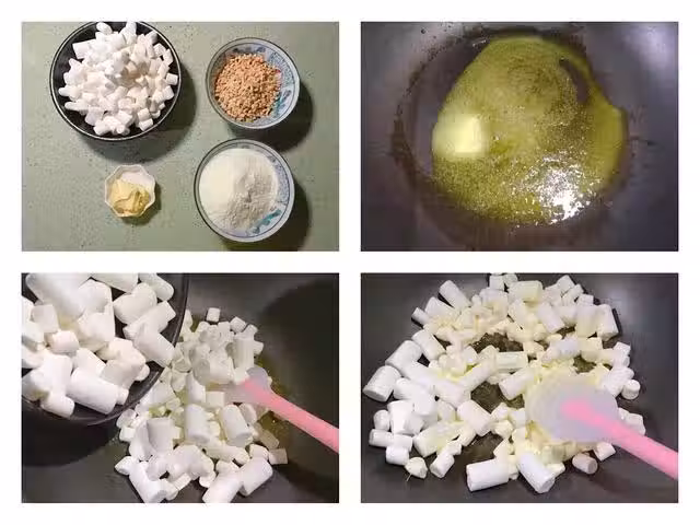 第二步:棉花糖翻炒至糖化後,倒入奶粉立刻關火,利用餘溫將棉花糖與奶粉翻版混合均勻,接著倒入花生碎,用刮刀刮拌混合均勻,稍稍不燙手時,用手再將糖揉勻。熟花生碎可以用杏仁或者草莓乾等代替,可以根據個人的愛好選擇。
