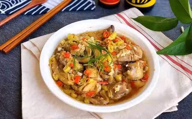 2、雞肉浸泡好後,撈起來瀝干水分,加入生薑、蚝油、豆瓣醬、生抽抓取均勻混合入味。腌制30分鐘左右,使其更加入味。