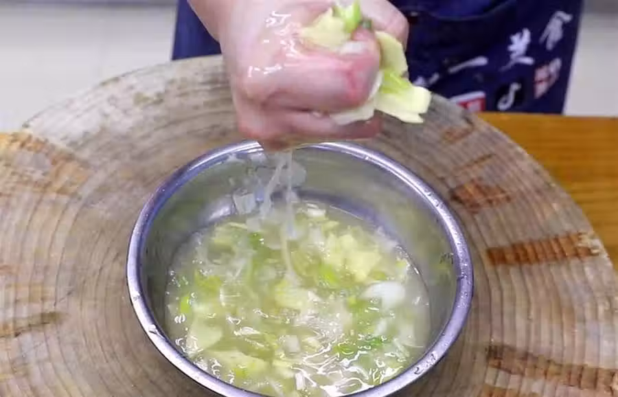 準備五花肉一塊,先切成肉片再剁成肉末,把調好的蔥姜水少量的淋入肉餡裡面,快速地攪拌、摔打,把蔥姜水充分吸收,再少量淋入蔥姜水充分攪拌摔打,把水分被全部吸收,這樣既能讓肉餡變得飽滿又能去腥增香,千萬不要用料酒去腥,不然酒精揮發不出去會影響肉餡整體的鮮美感。