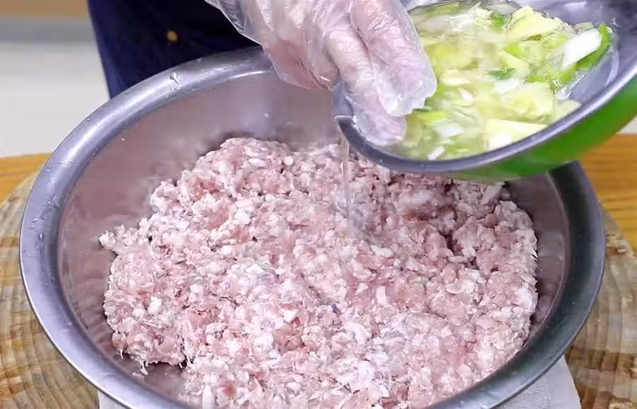 打過蔥姜水以後,分次淋入剛剛熬好的花椒水,前期的蔥姜水主要是去腥增香不要打太多,否則花椒水的香味不能充分滲入到肉餡裡面,蔥姜水的用量要根據實際情況而定,以肉餡呈現出滑嫩飽滿的狀態為最終目的,盡可能地多打一些,這樣肉餡才更滑嫩、鮮香、多汁。