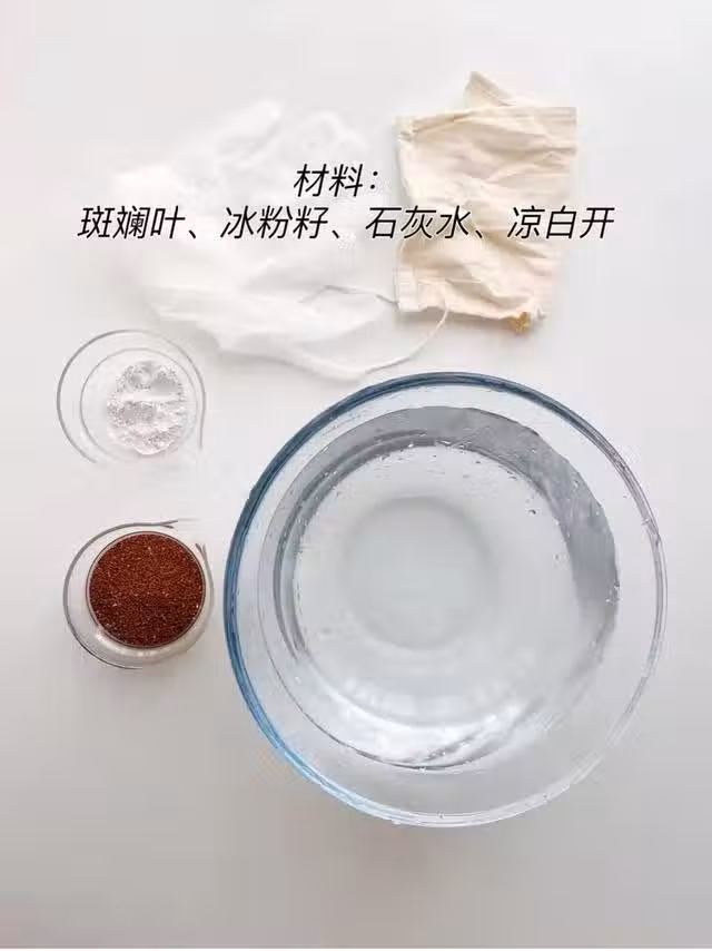 3、冰粉籽放口袋裡,簡單沖洗後放進斑斕汁里浸泡幾分鐘,開始搓冰粉。大概搓幾分鐘後把漿搓完了即可。