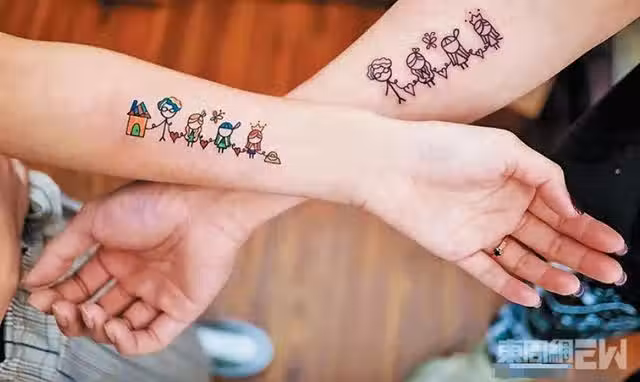 右手內前臂上,有一家四口的公仔紋身,可見他對家庭十分重視。