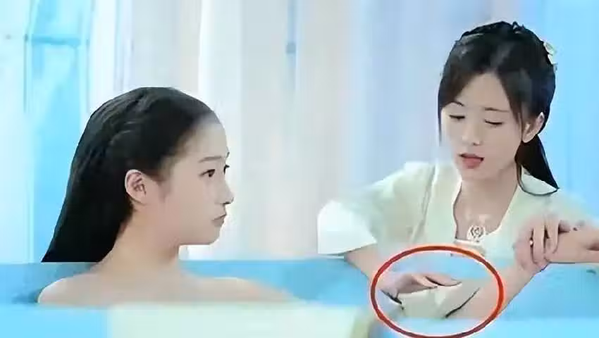 這場戲是關曉彤作為小姐在洗澡,而鞠婧禕作為丫鬟在一旁替她擦身體,原來好好的畫面看起來卻有點怪怪的。