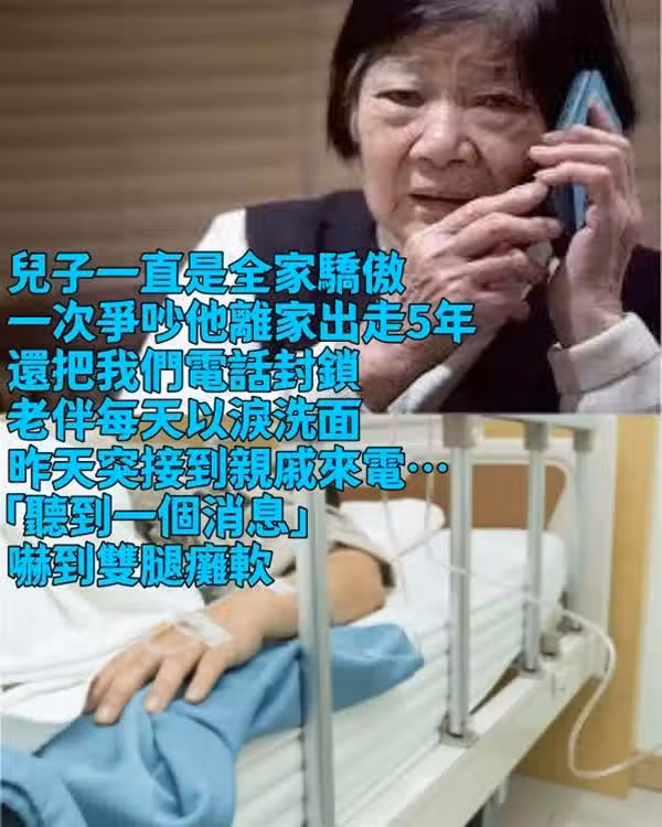 兒子一直是全家驕傲,一次爭吵他離家出走5年,還把我們電話封鎖,老伴每天以淚洗面,昨天突接到親戚來電…「聽到一個消息」嚇到雙腿癱軟