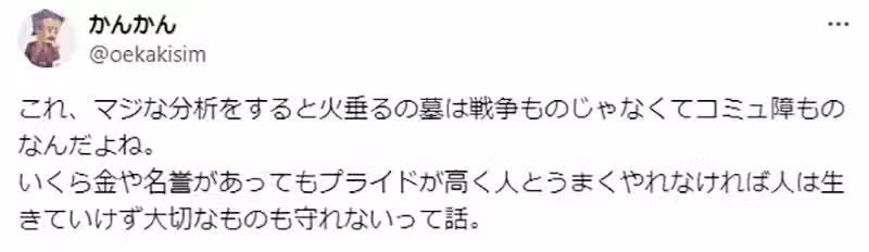 宮崎駿:「(前略)巡洋艦艦長的兒子絕對不可能餓死,那是隱瞞了戰爭的本質。就如同野坂昭如沒有餓死一般,他們也絕對不會餓死。靠著海軍士官之間的互助情誼,絕對會有得救的方法。何況巡洋艦艦長,更是海軍士官中的高級菁英,團結力更是強大。一聽到神戶遭受空襲,管區的士官們絕對會伸出援手,或是派遣下屬去找兩個孩子才對。」