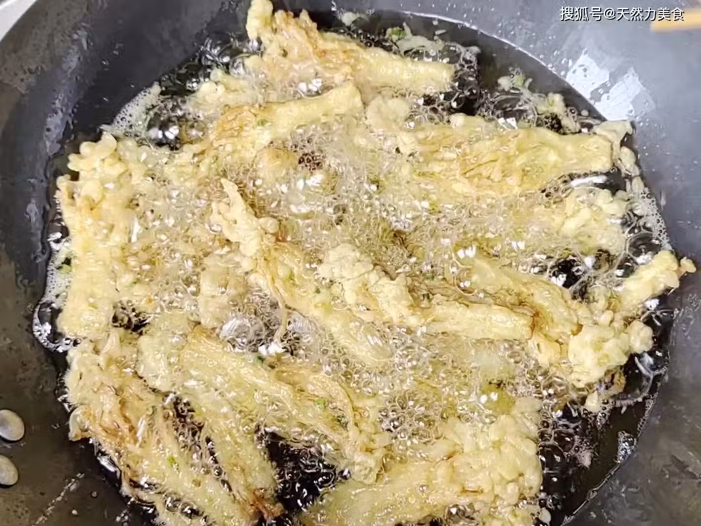 4、復炸的全程都要保持大火,大概炸上2分鐘左右,金針菇的外表顏色就應該很金黃,裹在金針菇外面的脆皮糊也變得很酥脆了,這時就要撈出控油,如果再炸下去就要過火了。