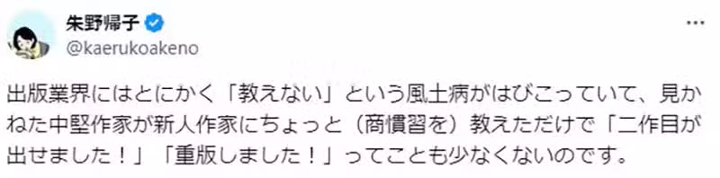 《日本小說家朱野歸子》呼籲同行藉由同人誌分享出書經驗,因為出版業都不喜歡教新人?