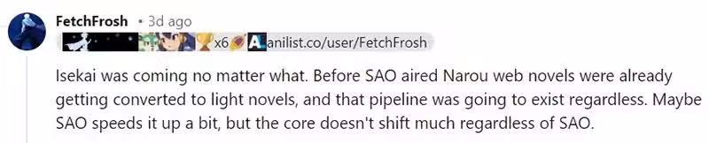 「異世界始終都在那裡,只是《刀劍神域》推動了更多異世界糞作的興盛。」