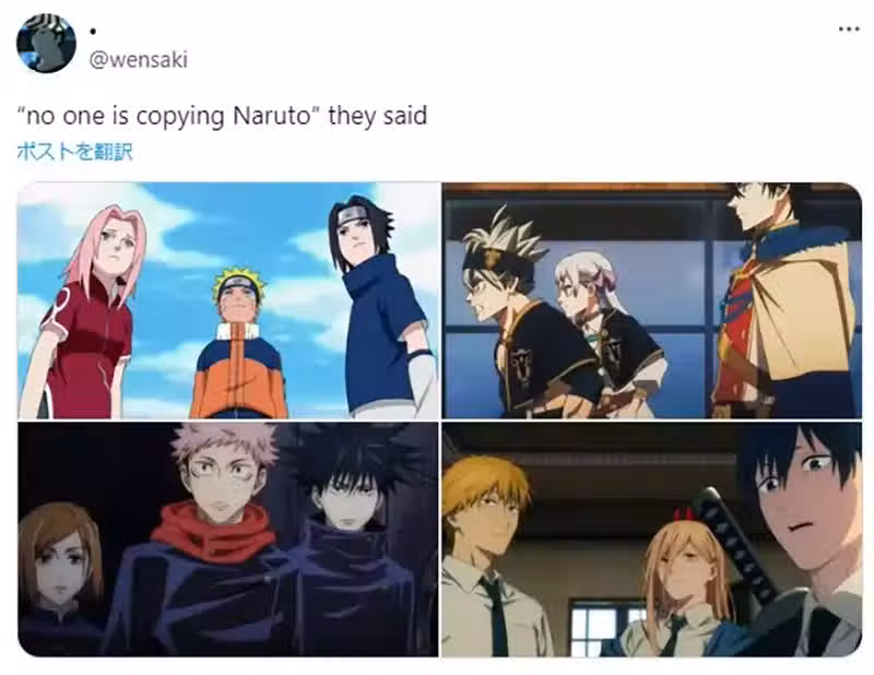 這位暱稱「wensaki」的X網友,最近發文吐槽很多動漫作品抄襲《火影忍者》的「兩男一女的三人組」這個概念……