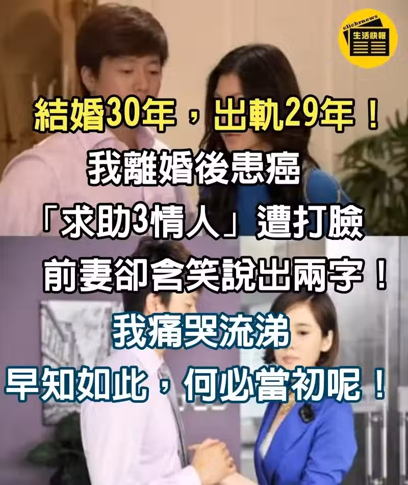 結婚30年 「出軌29年」!前夫離婚後患癌「求助3情人」遭打臉 前妻卻含笑說出兩字