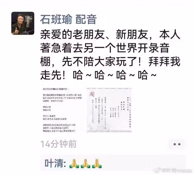 與此同時,好友公開了其最後遺言,真的是讓人淚目:親愛的老朋友,新朋友,本人著急著去另外一個世界開錄音棚,先不陪大家玩了,拜拜先走。哈哈哈。