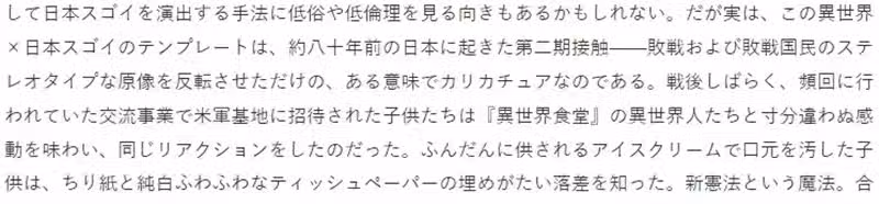 「異世界轉生這一類小說的興起與流行,長期以來被理解為是因為作者和讀者都不掩飾地渴望滿足自身慾望,而小說投稿網站又恰好能夠供應這種需求。然而這種慾望無非就是,這次我們想要成為GHQ(駐日盟軍總司令)的那一方,這是戰後神話的反轉。對我們來說,理想的世界永遠存在於某個遙遠的異世界(如犍陀羅)之中,而構築理想世界的力量,要麼是自上而下賦予的,要麼是被給予的。在這種落差帶來的一擊逆轉的魅力面前,自發性的獨立心與漸進性根本無法被接受。我把這種異世界轉生類型的發生原理稱為『給我巧克力症候群』。」