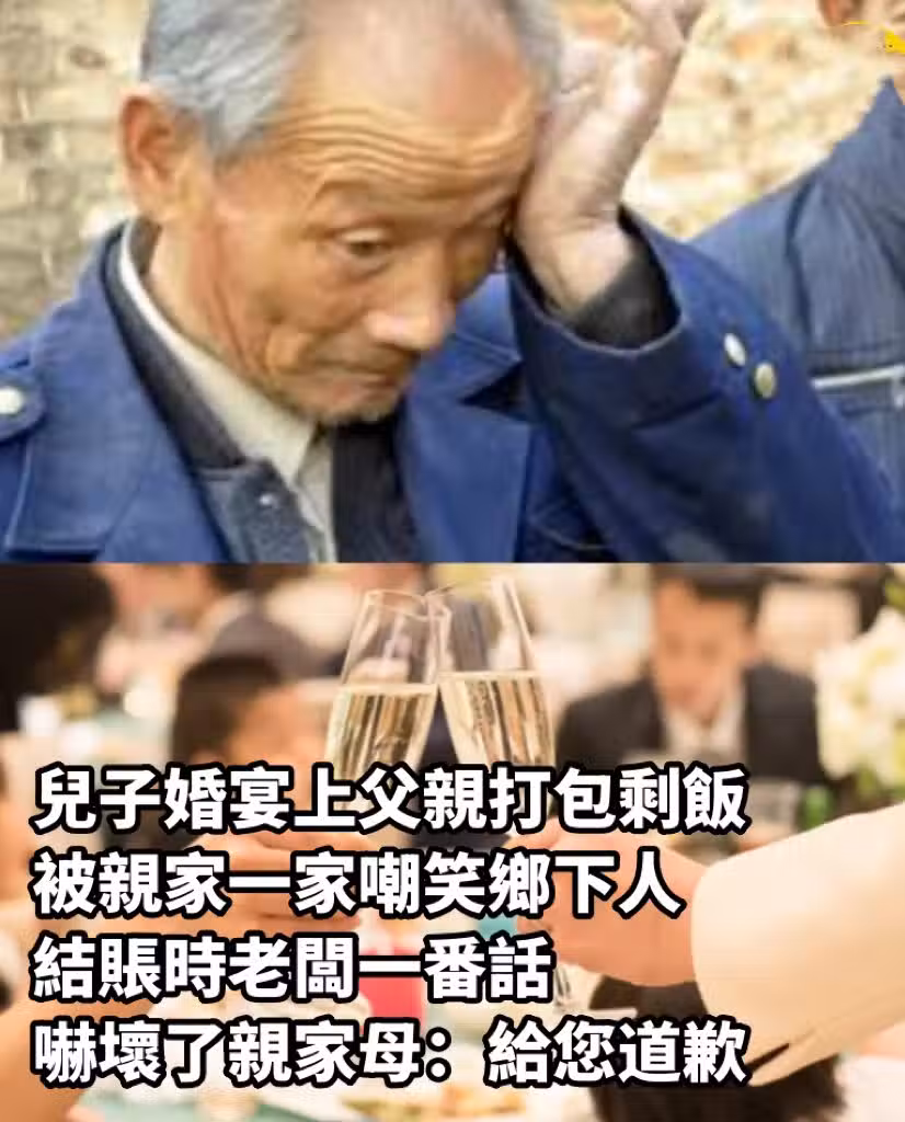 兒子婚宴上父親打包剩飯被親家一家嘲笑鄉下人,結帳時老闆一番話,嚇壞了親家母: 給您道歉