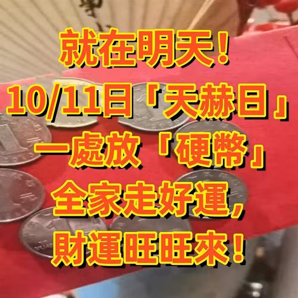 就在明天!10/11日「天赫日」一處放「硬幣」全家走好運,財運旺旺來!!