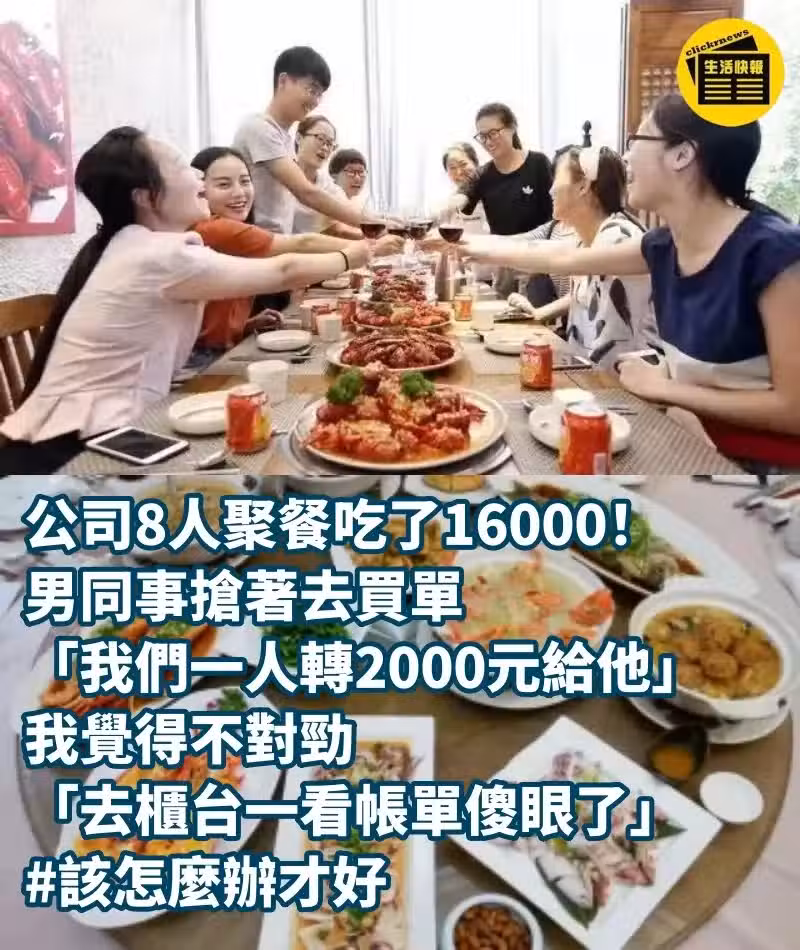 公司8人聚餐吃了16000!男同事搶著去買單「我們一人轉2000元給他」,我覺得不對勁「去櫃檯一看帳單傻眼了」# 該怎麼辦才好