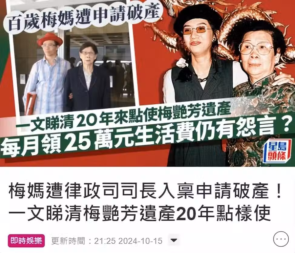 據悉,梅艷芳在2003年去世後留下4條遺囑,受益人包括梅媽、侄子、外甥及好友劉培基,梅媽是最大受益者,每個月可領7萬生活費,待其百年之後捐出剩餘的財產。