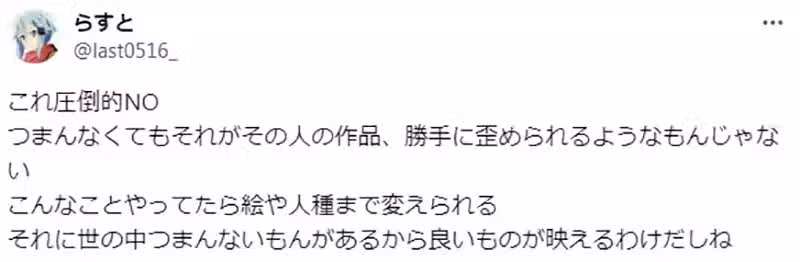 「我覺得萬惡的根源終究還是因為編輯的工作是『不要讓作品完結』。如果那些傢伙可以想著『如何讓作品好好收尾』的話,就能夠大大改善很多作品出現不知所云的劇情,或是一直拖戲的問題了。」