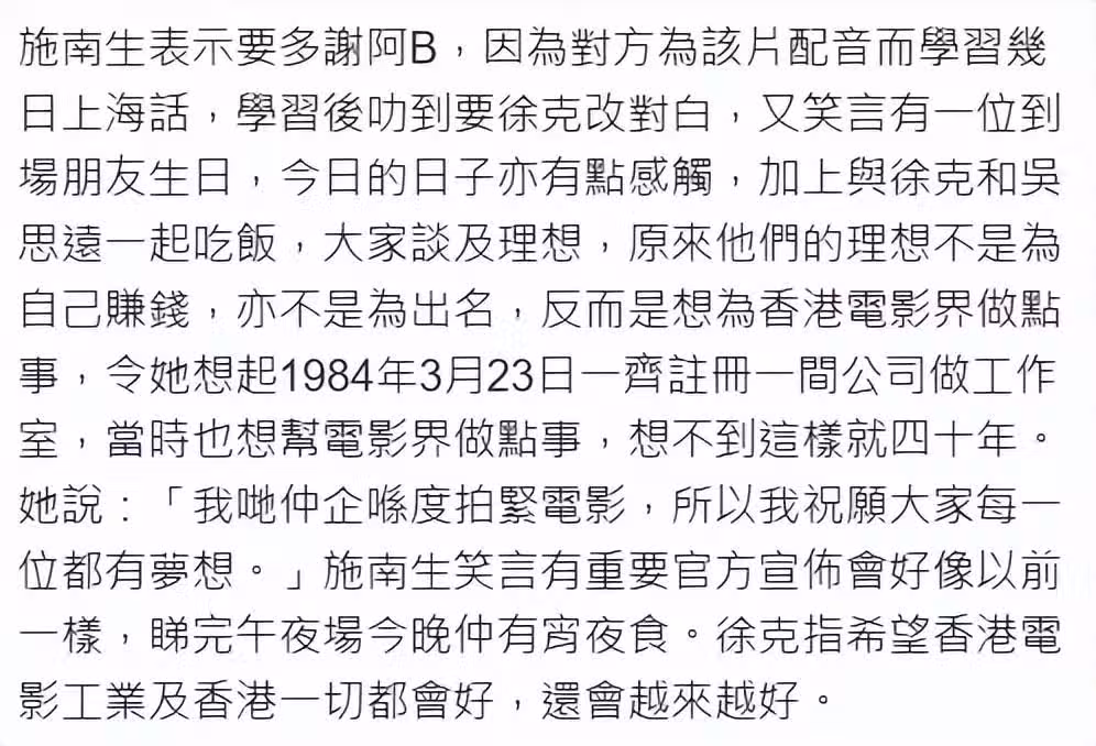 兩人合作的《上海之夜2024》4K修復版在香港首映,施南生觸景生情,她說很感謝鍾鎮濤,為了這部片專門學上海話,後來還幫徐克改對白,當天有一位朋友過生日,她和徐克、吳思遠一起吃飯,大家談到了理想才發現,當年不是為了賺錢也不是出名,而是想為香港電影做點事。