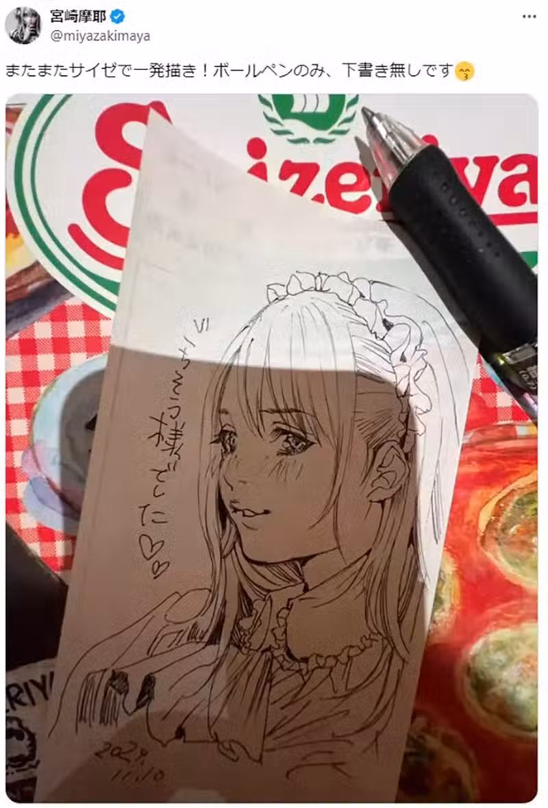 日本資深漫畫家宮崎摩耶,最近在X分享了她去連鎖餐廳「薩利亞」用餐,並且在餐廳的點餐單背後塗鴉的照片……