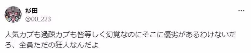 「什麼冷門CP啦!!!煩死了!!!才沒有這種詞彙!!!只要相信自己喜愛的CP就好了!!!CP是存在於你的靈魂之中啦~~!!!只能靠你自己相信到底啊~~!!!不過如果要從事二創,就要記得一件事。那就是不論哪一個CP,全都是由妄想集結而成的集團歇斯底里啦。」