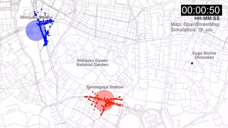模擬開始2分56秒,第一對瀧與三葉相遇了(綠點)