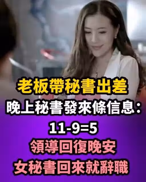 老闆帶秘書出國公幹,晚上秘書發來條信息:11-9=5,領導回復晚安,女秘書回來就辭職