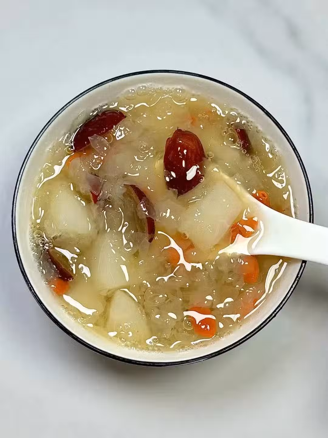 一到冬天,皮膚就會幹燥起皮、嗓子也經常不舒服、干癢咳咳,可以安排這個膠質滿滿的雪梨銀耳湯。