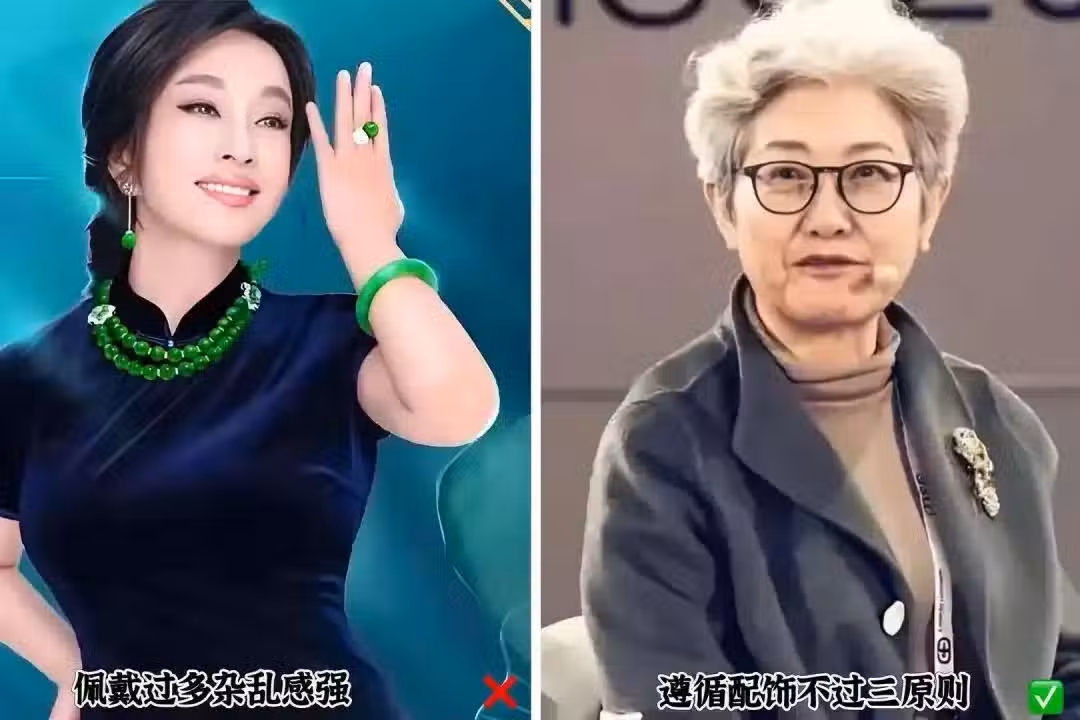 而反觀,旁邊傅瑩戴著眼鏡加上精美的胸針,整個人看起來就有種歲月靜好的感覺,也放大了配飾的細節感,整個人的穿搭與配飾也有著主次之分了。