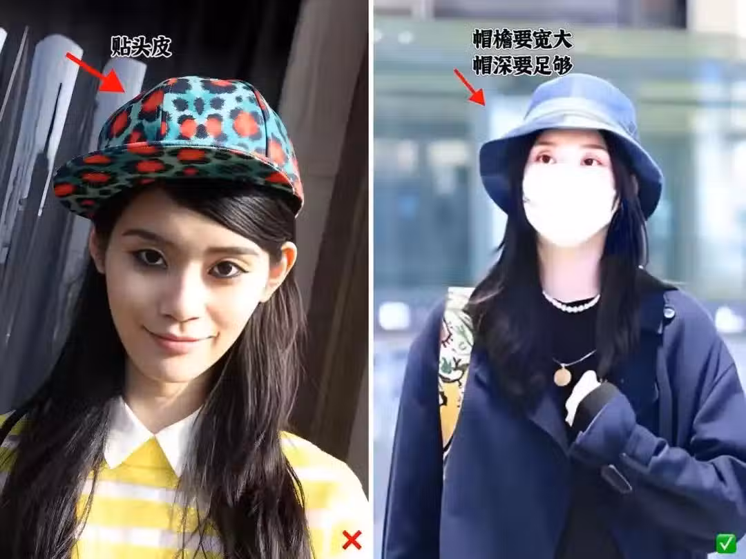 而後期,她注意到這個問題之後,選擇的帽子基本上就是帽檐寬大,且帽深也足夠,這樣剛好可以在凹陷的太陽穴處隔斷,顴骨被弱化,臉型自然就流暢了,整個人也變得更為靚麗了。