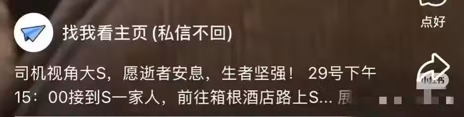 2月4號,關於大S去世細節的曝料再度引髮網友熱議。事源於有一位網友分享出具俊曄大S來到日本旅遊當天的畫面,並在留言處表示:司機視角大S,願逝者安息,生者堅強,29號下午15:00接到S一家,前往箱根酒店路上。