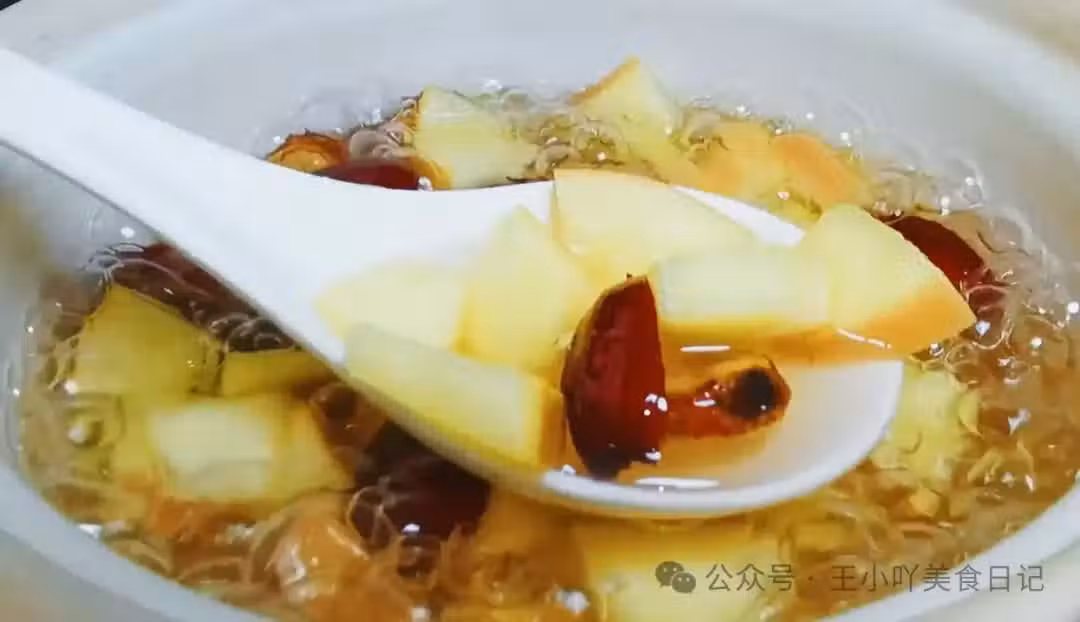7、調味與收汁:20分鐘後,打開鍋蓋,用勺子輕輕攪拌,此時食材已變得軟糯,湯色也變得金黃誘人。如果喜歡甜味,可以加入幾塊冰糖,繼續煮制至冰糖完全溶解。冰糖不僅能增添甜味,還能調和山楂的酸味,使湯品口感更加和諧。