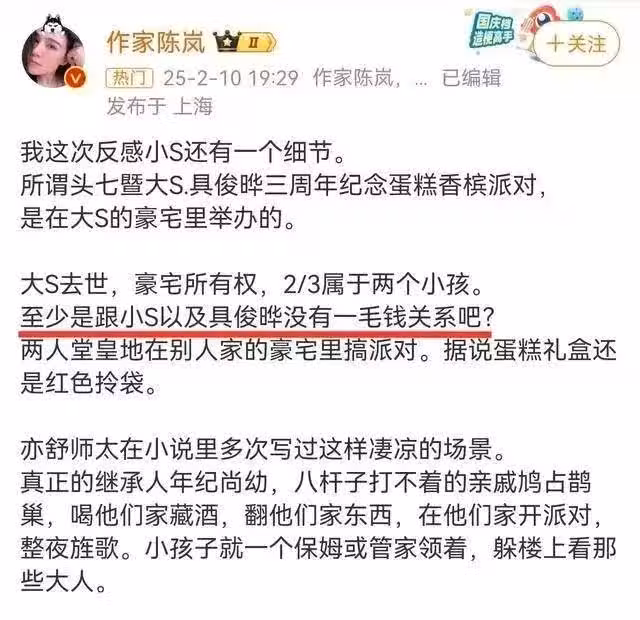 陳嵐說:「大S離世,豪宅所有權,三分之二屬於2個孩子,至少跟小S和具俊曄沒有關係吧,你們在豪宅堂而皇之搞派對,喝他們家的酒,翻他們家的東西,算怎麼回事?」