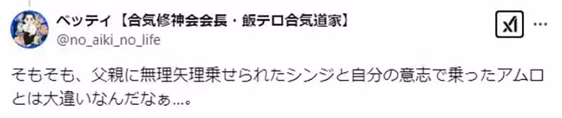 「我覺得阿姆羅和真嗣最大的差異在自信,或者該說不會隨波逐流的堅強自我。阿姆羅只是因為平常都窩在家裡搞些機器,所以不太習慣軍中那種團體生活和人際關係,但是他的自我非常堅強。而且這個問題後來也在白色基地上克服了。」