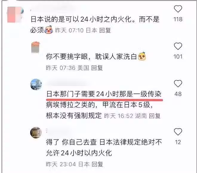 附有IP 地址是日本的網友稱,就在大S剛離世的時候,其實她的家人沒必要非得立馬就去火花,意思是說,如果不是得了一級傳染病像伊波拉之類的,是可以再等等的。