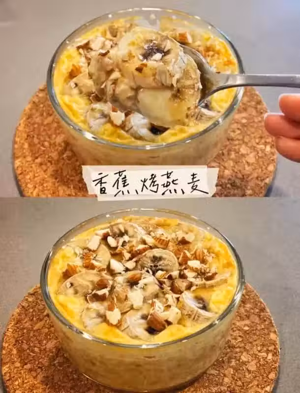 1.半根香蕉 用勺子壓成泥鋪在烤碗中 再倒入傳統燕麥