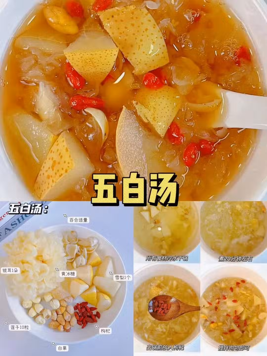銀耳一朵、雪梨一個、白果、百合、蓮子、枸杞、黃冰糖