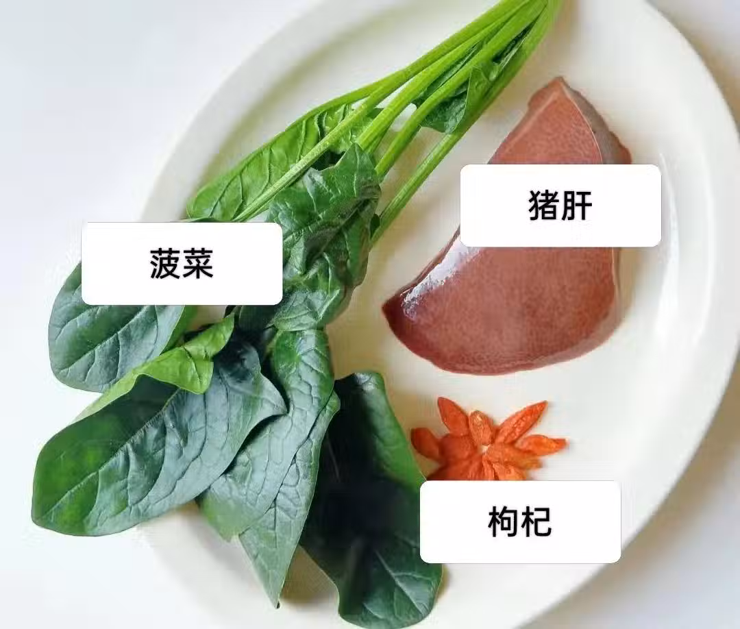 ❶豬肝切成薄片,菠菜洗乾淨切段,枸杞洗乾淨,姜切絲備用。