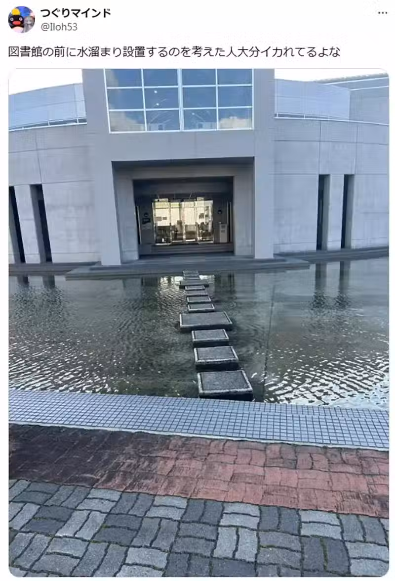 從他分享的照片可以看到,這間圖書館的出入口竟然正對著一個水池。人們必須跳過好幾個「飛石」,才可以從這裡進出。日本網友們看了就紛紛吐槽,說這樣不但會害人跌倒,導致珍貴的書籍泡水。也會有周邊濕度過高,或是漏水漏到地下室等問題,嚴重危害書籍的保存,怎麼會這樣設計呢!?