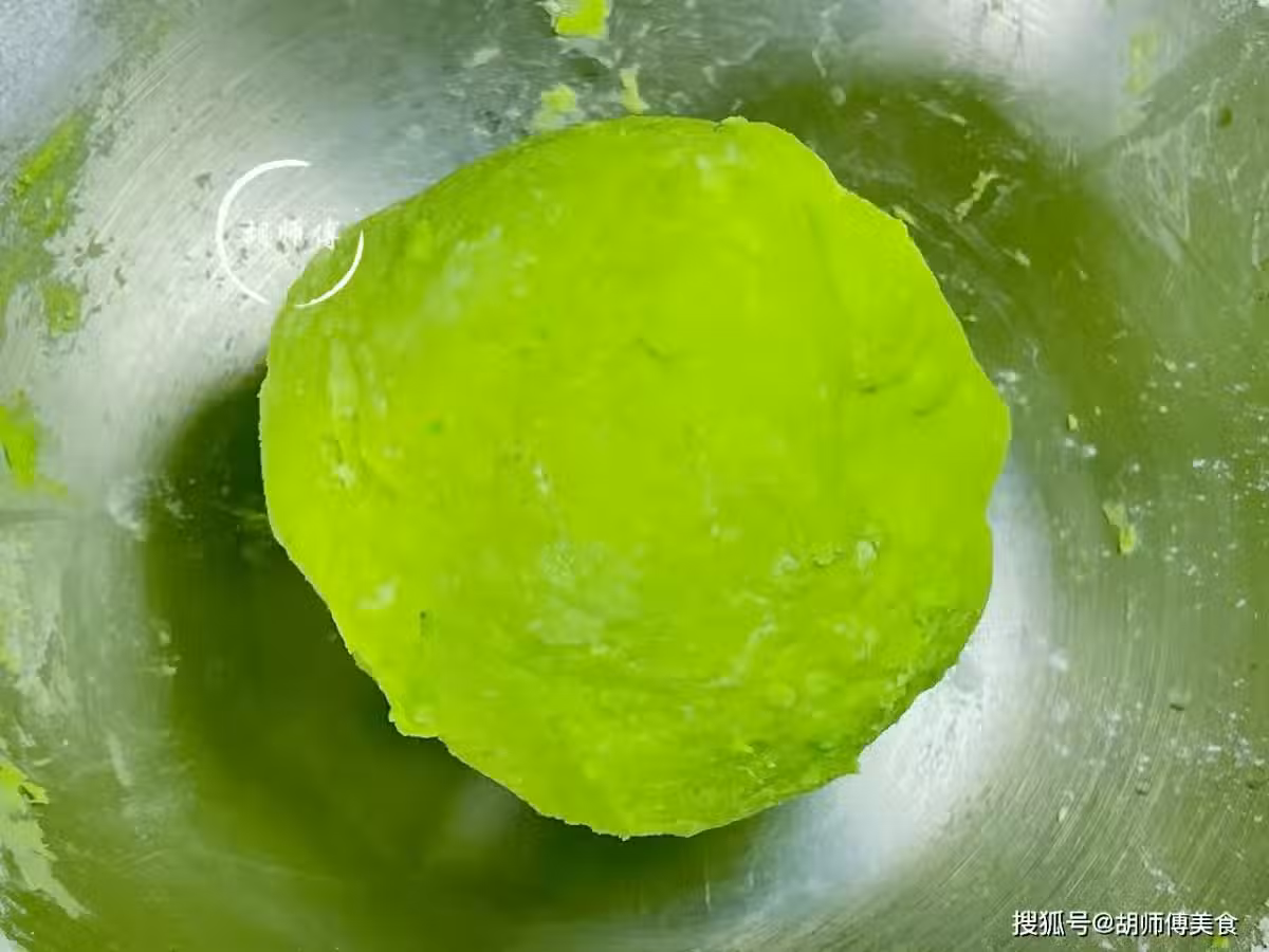 第三步:將豌豆汁和一點點食鹽、麵粉全部放入盆中,然後快速攪拌攪拌,將它們攪拌成面絮後用手揉,直到將面絮揉成光滑的麵糰即可。