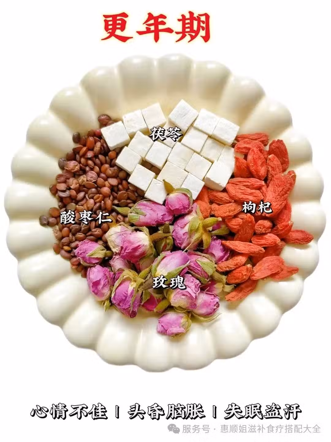 材料:茯苓10克、酸棗仁10克、枸杞10克、玫瑰2朵、甘草3克