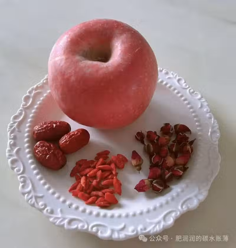 做法:半個蘋果切塊+800ml水煮10分鐘,加干玫瑰10朵、紅棗3顆再煮5分鐘,最後放枸杞燜3分鐘。