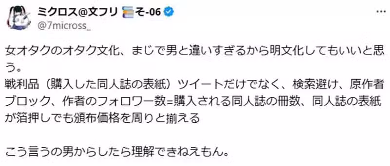 「女性向的圈子真的很異質。什麼事都要顧慮、顧慮再顧慮,如果沒做好避免搜尋的工夫,,就會被抓出來公審,甚至被整個圈子排擠。也許宅男們無法相信,但在宅女圈裡,寫出角色的全名本身就是一種禁忌。」