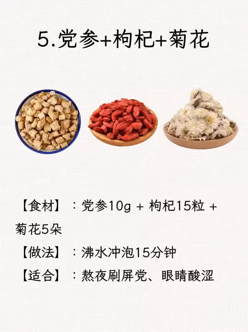 5. 黨參+枸杞+菊花:清肝明目,緩解疲勞